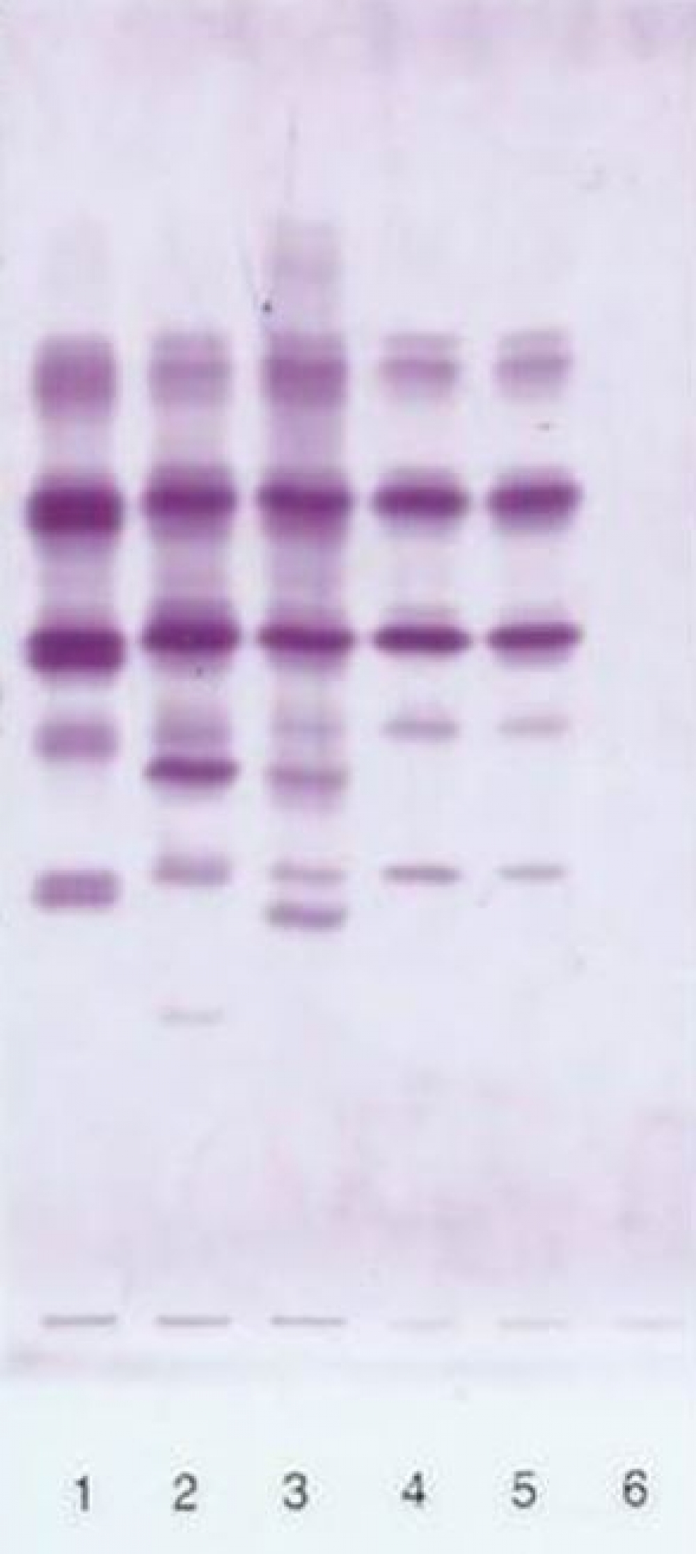 AAT phenotyping by IEF on agarose gel. The index case is in lane 6 (no band).; lane1: MM control; lane 2: MS control; lane 3: MZ control; lane4 and 5: Q0ourém in heterozygous state