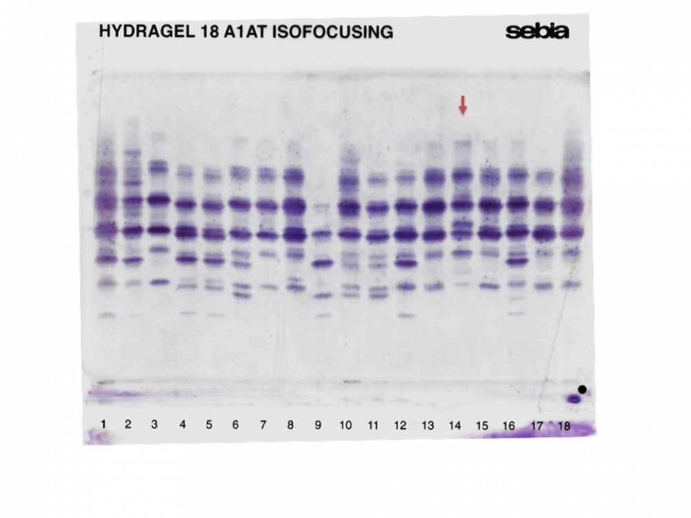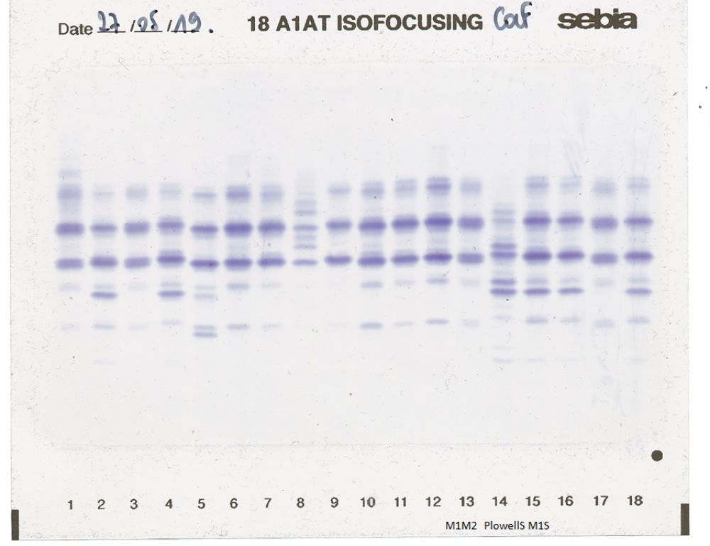 IEF pattern on agarose gel: M1 Plowell in lane 14